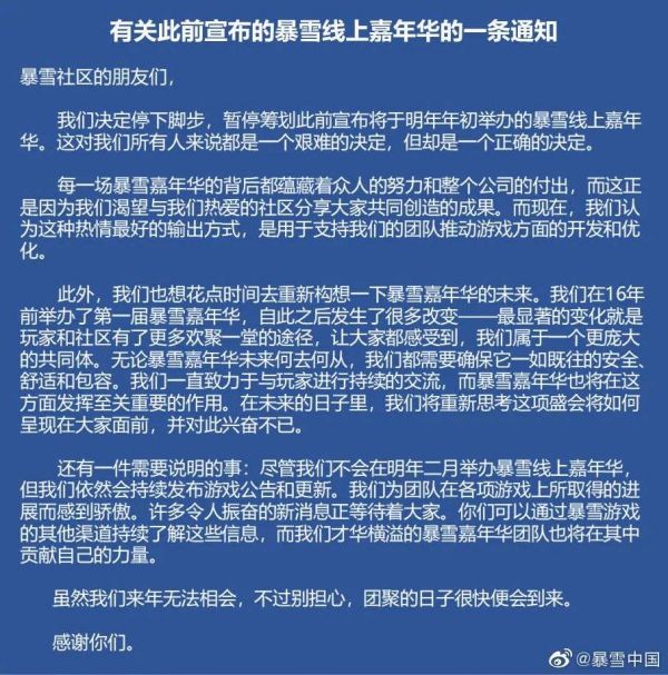 暴雪中国在微博上发布了这条通知(图片来源:暴雪中国)