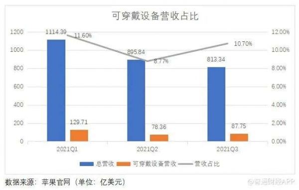 近些年来,随着苹果可穿戴设备产品矩阵丰富度的增加, 该业务带来的营收不断增长,由 2015财年Q2的16.89亿美元(营收占比为 3%)提升至2021财年Q3的87.75 亿美元(营收占比为 10.7%),成为苹果第三大业务(按营收计算)。
