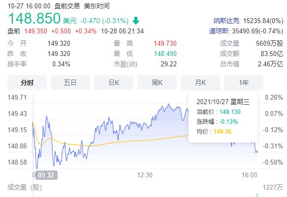 截至27日收盘,苹果股价跌0.31%,报收148.85美元,总市值2.46万亿美元。