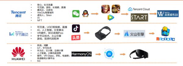 现在世界互联网巨头纷纷加入了对元宇宙的布局,国内科网巨头如腾讯、华为、字节的布局更多是在5G、云计算、AI、VR、AR等底层技术领域。
