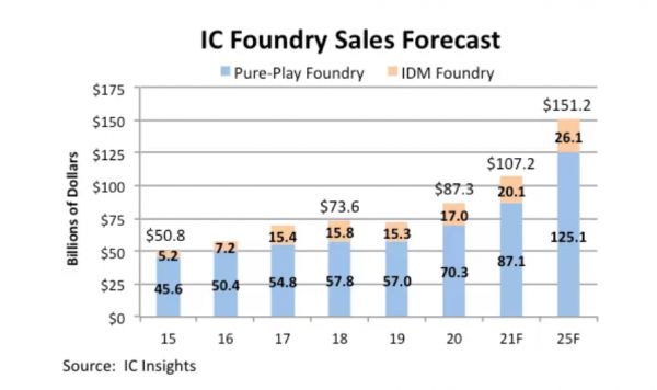 不久前,IC Insights发布的统计和预测数据显示,2021年全球晶圆代工厂总销售额将首次突破1000亿美元大关,增至1072亿美元,增长23%,与2017年创下的创纪录增长率相媲美。到2025年将以11.6%的强劲年均增长率增长,届时代工厂总销售额预计将达到1512亿美元。