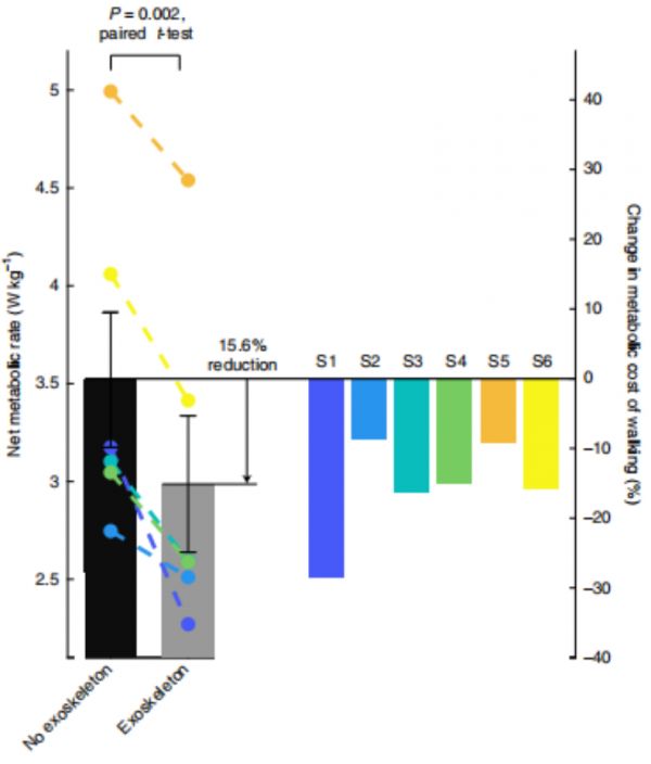 图|带和不带外骨骼行走的代谢成本比较(来源: Nature Medicine )