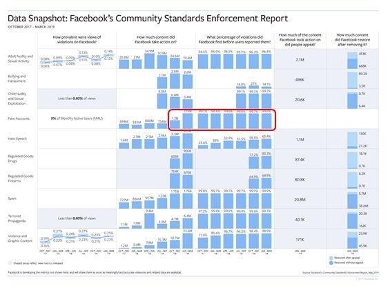 由于增加了用于检测有害内容的人工智能技术和人力资源,2018年10月到2019年3月期间,Facebook共对33.9亿个虚假账户采取行动,较2018年4月到9月期间的数据翻倍。其中,今年一季度有21.9亿个虚假账户被移除,是去年同期的三倍,也较去年四季度的12亿翻倍。