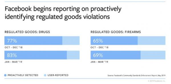此外,今日发布的报告增设了两个新内容,即首次披露对平台上管制物品销售内容的采取行动信息(包括移除内容、贴上警示标语或者废除账户),主要指枪支武器和毒品相关的内容;同时,Facebook首次披露了用户申诉被管控内容的数据,以及审查后恢复相关内容展示的数据。