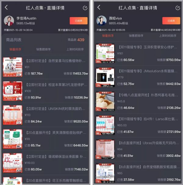 据知瓜数据显示,20号预售当天李佳琦带货商品数为439件,美妆占比将近70%。优势在于“全品类”的薇娅,当天上架499件商品,也将美妆占比提高到一半以上。美妆护肤类均是两者直播间成交额TOP 1。