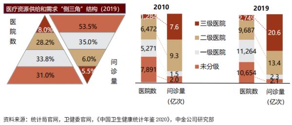 公开资料显示,我国医疗资源供给和需求呈现“倒三角”结构,占国内医院总数8.0%的三级医院承担了全国53.5%的诊疗人次数。