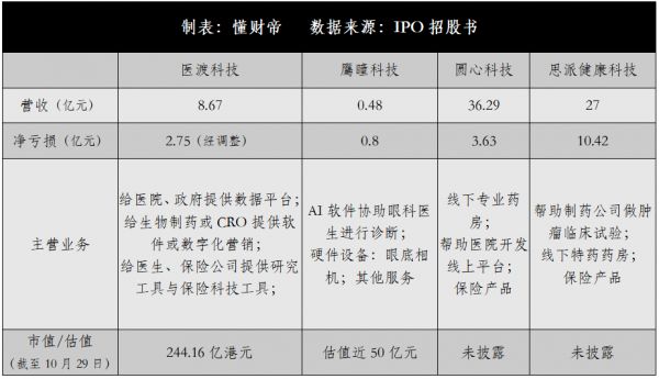 基于此,本部分选取医渡科技、鹰瞳科技、圆心科技、思派健康科技四家公司为样本,通过分析营收、利润、主营业务等情况,来探讨这些公司是否开启了“互联网健康”之外的新业态,以及各自的优劣势。