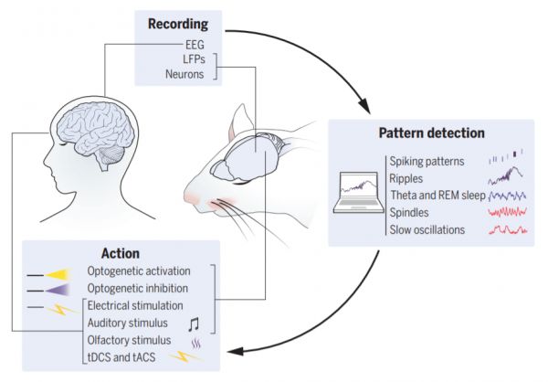 在研究方法上,研究人员通过闭环实验对大脑信号进行实时处理,检测睡眠模式,同时使用能够实时影响神经网络的介入方法,自动触发给定模式的检测,以检验某个操作是「促进」还是「损害」记忆巩固。