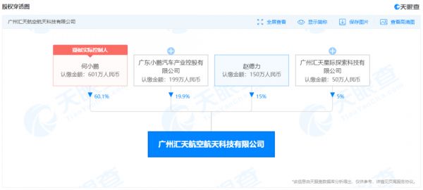 后来通过一个因为播放器入狱的朋友的介绍,何小鹏认识了赵德力。何小鹏在赵德力东莞的飞行基地试飞了一圈后,2020年9月23日,何小鹏、小鹏汽车出资,收购赵德力的团队和产品,组成新品牌:小鹏汇天。据天眼查APP显示,何小鹏占股60.1%,小鹏汽车占股19.9%,赵德力和他的团队分别占股15%、5%。