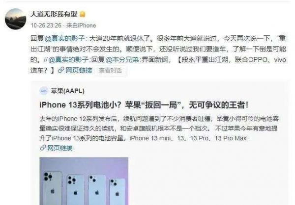直到10月25日,业内人士爆料称,段永平已“重出江湖”,将牵头成立全新公司“造车”,新公司出资方包括OPPO、vivo和小天才。次日,段永平通过社交媒体辟谣。