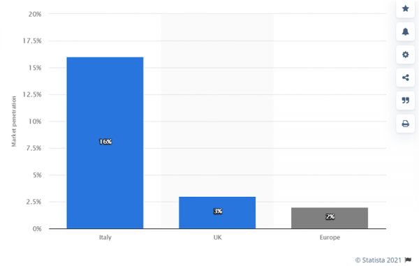 UBI保险并非新鲜事物,欧美地区在2015年左右就有保险公司进行过尝试和推广,但至今全球推广最好的国家意大利也只有16%的渗透率——大部分人还是选择了传统车险。