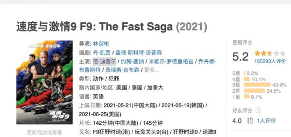 今年《速度与激情9》为了中国市场特意提前北美一个多月公映,但票房从上一部的26亿大幅缩水至不到14亿,口碑也明显下滑。