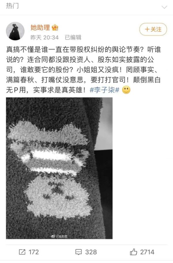 对此,李子柒的助理在微博上回应:连合同都没跟投资人、股东如实披露的公司,谁敢要它的股份?小姐姐又没疯!罔顾事实、满篇春秋、打嘴仗没意思,要打打官司!