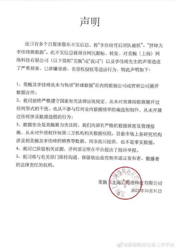 针对近日网传“李佳琦背后团队被抓”、“胖球为李佳琦做数据”,10月31日,李佳琦直播官方微博发布声明称,美腕(上海)网络科技有限公司及李佳琦从未与包括“胖球数据”在内的数据公司或营销公司展开数据合作。该不实消息被部分网民跟帖、转发,对美腕以及李佳琦先生的声誉造成了严重损害,已涉嫌诽谤、名誉权侵权等违法行为,美腕已保留相关证据,并向谣言所在平台提出了投诉举报。