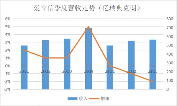 爱立信财报数据显示,今年一季度爱立信销售额结束了2020年增长态势,当季度同比持平,而二季度和三季度则分别迎来了1%和2%的同比下滑。