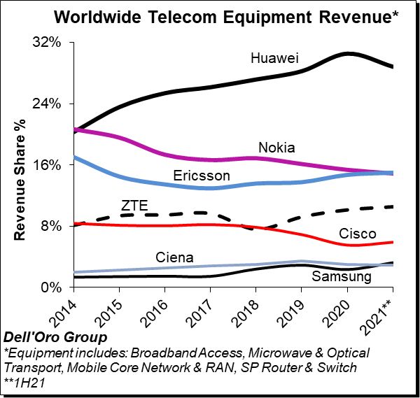 根据市场研究公司Dell'Oro Group发布的2021年上半年全球电信基础设施市场报告显示,虽然华为的市场份额有所下降,但仍以28.8%遥遥领先,而爱立信为15%。