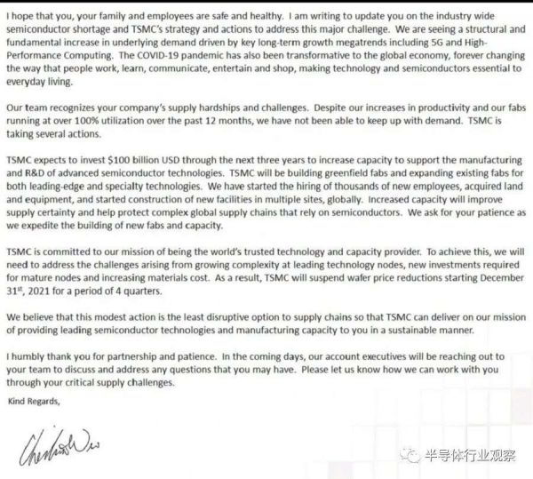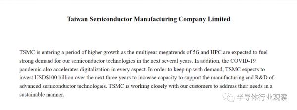 而“三年投资1000亿美元”首次提及是在今年3月底,网络上流传着台积电总裁魏哲家亲自署名发给客户的英文长信,信中提到,为了应对全球整个半导体产业产能短缺的问题,台积电将在未来三年投资 1000 亿美元来增加产能,并且支持高端制程技术的研发。