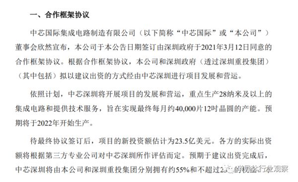 3月17日晚,中芯国际发布公告称,公司和深圳政府(透过深圳重投集团)(其中包括)拟以建议出资的方式设立晶圆厂,重点生产28纳米及以上的集成电路和提供技术服务,旨在实现最终每月约40000片12英寸晶圆的产能。预期将于2022年开始生产,项目新投资额估计为23.5亿美元。
