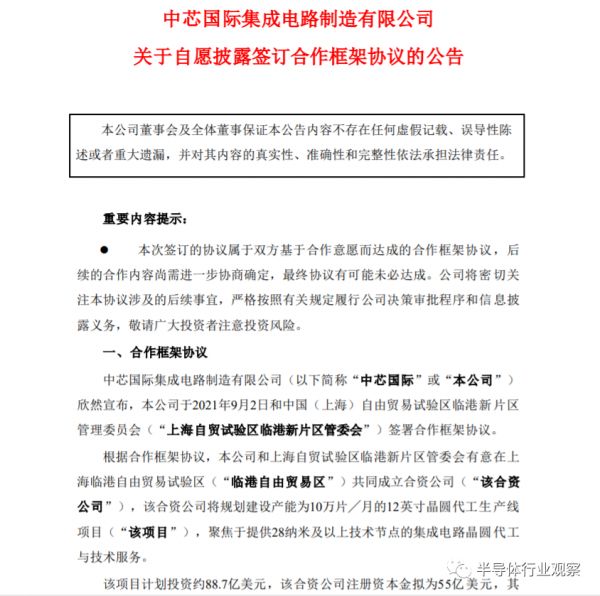 8月,中芯国际再次发布公告称,和中国(上海)自由贸易试验区临港新片区管理委员会签署合作框架协议,有意在上海临港自由贸易试验区共同成立合资公司,将规划建设产能为 10 万片/月的 12 英寸晶圆代工生产线项目,聚焦于提供 28 nm及以上技术节点的集成电路晶圆代工与技术服务。