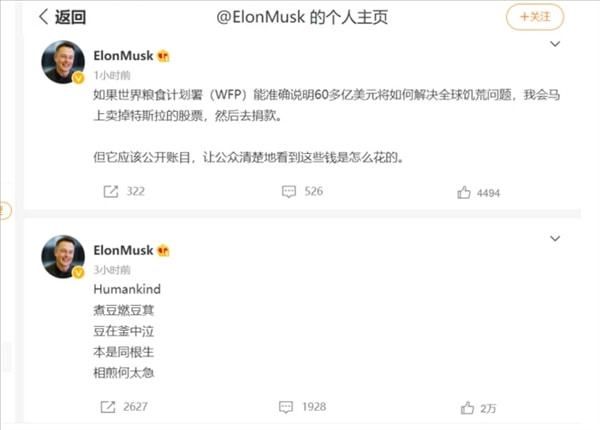 马斯克曾对这条“喊话”回应到,“如果世界粮食计划署能在这个推特帖子回复中准确讲述60亿美元将如何解决世界饥饿问题,我将立即出售特斯拉股票并这样做。”