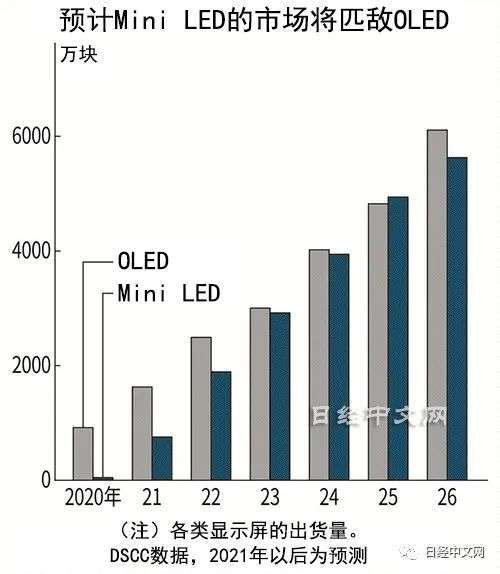 美国调查公司DSCC的数据显示,预计Mini LED液晶屏的世界供货量到2026年将达到5600万块。市场规模到2021年将增长超过7倍,与OLED相匹敌。以用于平板电脑的12.9英寸为例,背照灯的成本为传统液晶屏的3倍左右,成本削减成为普及面临的关键。