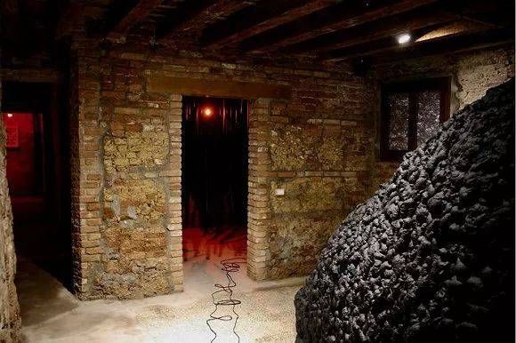 蒙古馆由一家威尼斯面包房改造而成。在如洞穴般狭长幽深的内部空间里,旅居洛杉矶的蒙古艺术家Jantsankhorol Erdenebayar创作了一系列黑色的建筑装置,或堆砌在房间角落,或悬挂在半空中,或包覆住天花板,宛如一个个深不见底的黑洞。空间内循环播放着德国艺术家Carsten Nicolai(又名Alva Noto)与蒙古喉音歌手合创的喉音电子乐,低沉又单调的颤音在狭窄的空间里回荡,令观众的心也仿佛随之颤动起来。抽象的音乐搭配抽象的空间设计,隐隐指涉蒙古这一马背上的草原民族因游牧生活方式而在物质文明发展上步伐缓慢,却又在全球工业时代被拉进了现代化进程中,令人思索人为/文化与自然/环境之间的关系。