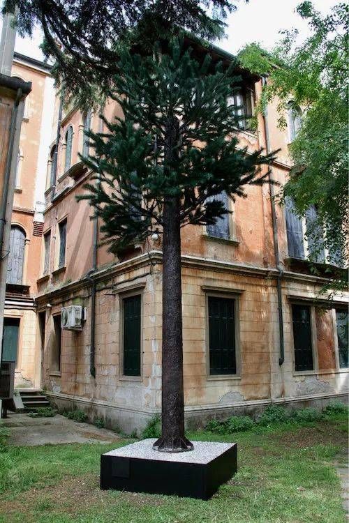 立陶宛在严格意义上不属于本文讨论的范畴(虽然这个1990年才宣布脱离苏联独立、2015年才加入欧元区的年轻国家与主流欧洲仍有不小的距离),不过在一些非欧洲国家馆,我们的确能看到沿袭这条思路呈现的惊喜之作。新西兰馆委托艺术家Dane Mitchell带来了一个题为“事后分析”(Post hoc)的艺术项目:六棵“松树”被“种”在威尼斯的各个角落,其中两棵位于新西兰馆所在地、前意大利国家研究委员会海洋科学研究所总部的庭院里。
