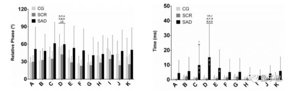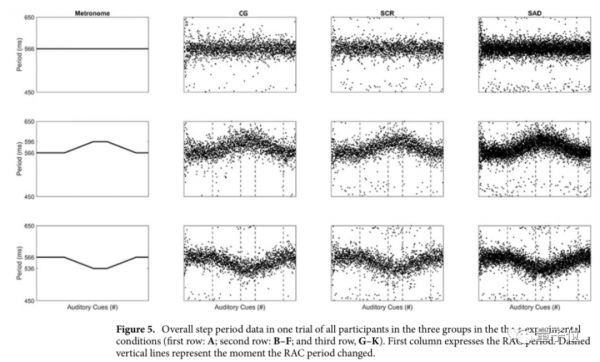 这种情况下,研究人员发现,SAD组(短期通宵)的综合步态表现最糟糕,几乎跟不上节拍器的节奏,在测试过程中出现的误差是最多的: