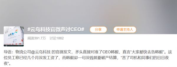 到目前为止,云鸟科技员工用官微曝料一事已过去数天,微博号注销、破产清算消息传出、相关词条阅读量突破百万,韩毅本人却始终不曾在大众视野露面。