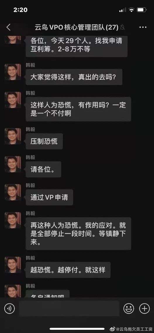 8月、9月、10月,三个月的工资压在员工们头顶,也笼罩着韩毅。按照员工对于媒体的描述,云鸟科技最多时拥有3800余名员工,几次三番的拖欠工资后大约还剩余1500名, “平均工资1至2万,高层会更多,可能牵扯到近亿元的资金。”