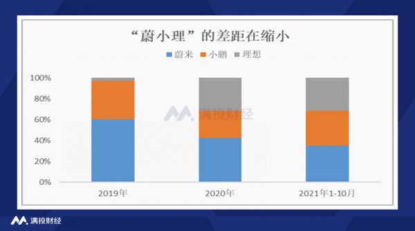 从近三年的累计汽车交付量来看,蔚来2019年的汽车交付量为20565辆,可以说是一骑绝尘,远超小鹏和理想,交付量占三家造车新势力总交付量的60%;2020年,随着理想的快速崛起以及小鹏的稳定增长,蔚来的份额被压缩至42%;到2021年1-10月份的累计交付量,三家造车新势力基本上三分天下,交付量的差距已经很接近,分别为70062辆、66542辆和62919辆,随着差距的缩小,竞争也越来越激烈,“蔚小理”的格局或将打破。