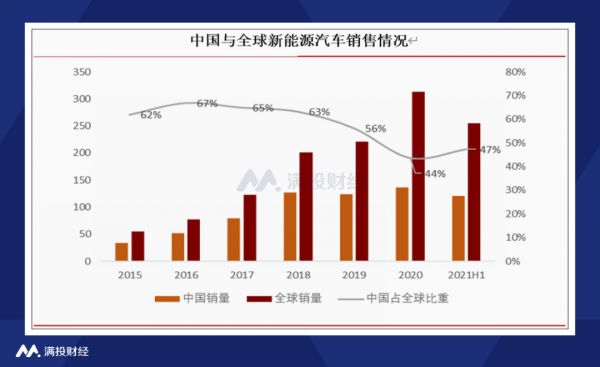 中国是全球最大、发展最快的新能源汽车市场,市场份额领跑全球。2021年上半年,全球新能源汽车的销量为254.68万辆,占全球汽车市场6.3%的份额,全球新能源汽车快速发展,仅2021年的上半年的销量就已经达到了2020年全年的78.6%。中国的表现更是不俗,今年上半年我国新能源汽车销量为120.6万辆,占全球新能源汽车的份额高达47%。