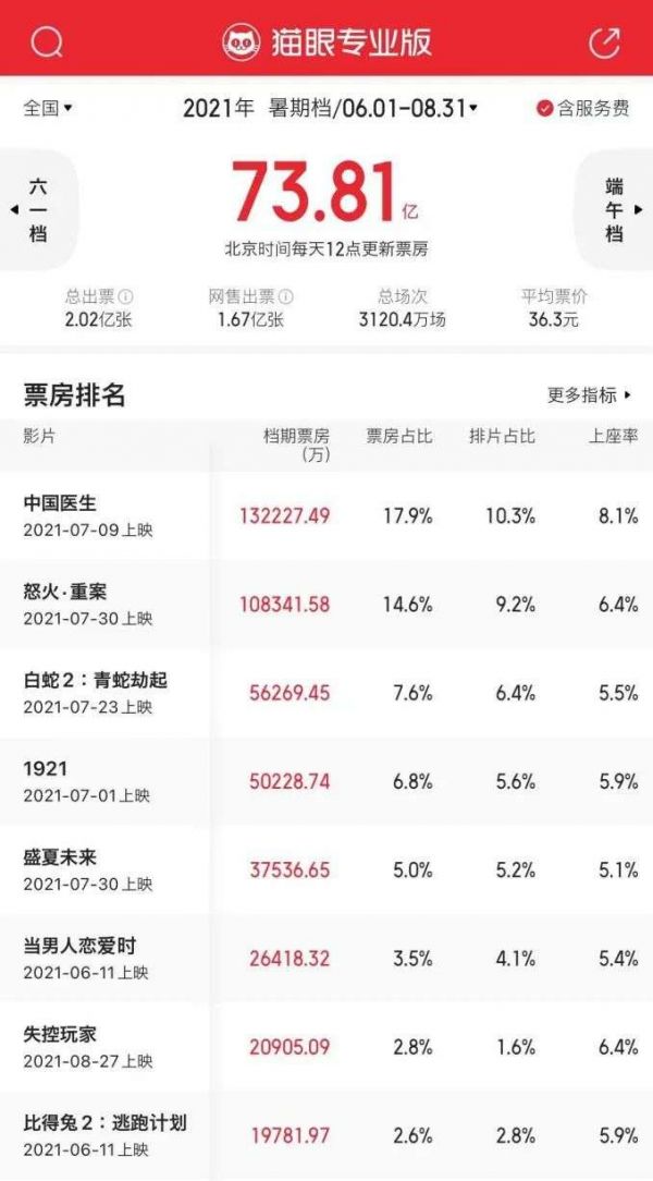 受到本土疫情反弹影响,本该成为大盘票房支柱的暑期档名存实亡。根据猫眼数据,今年暑期档总票房达73.81亿元,较2019年同期下滑超过100亿元。其中,《中国医生》《怒火·重案》成为该档期唯二票房超10亿的项目,头部项目明显势能不足。