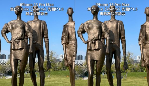 在触发深度融合的室外超广角样张中,比如 iPhone 的 0.9x 和 1x 的对比,虽然是底更小的传感器、光学素质更差的镜头,但是第一眼很难分辨哪个是 1x 主摄拍的。放大到中心以后,还是能看到细节的差异,尤其是树叶这种高频信息。