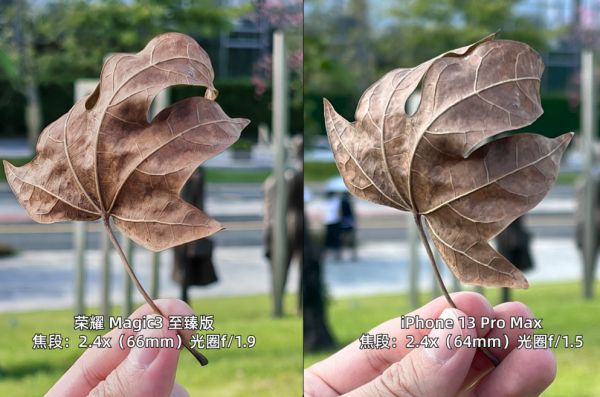 首先是正常手持的距离。这张枯叶,荣耀拍出的细节更多,而且树叶黄色更浓郁,这是因为荣耀保留了更多阴影。iPhone 则把阴影都提亮,导致拍出来画面更亮,同时黄色也被提亮,色相有些偏。这是 iPhone 一直以来的问题,拍黄色不好看。