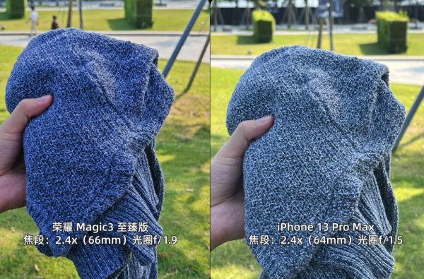 但是 iPhone 对蓝色的处理会更好,看这个蓝白色的毛衣,这种提亮暗部的方式,配合着深度融合的细节,第一眼很讨喜,荣耀的看上去很素。至于细节,这组对比其实两者旗鼓相当。至于拍摄皮革,能看到荣耀记录的细节颗粒度更小,但对整体画面观感没有其他明显提升。