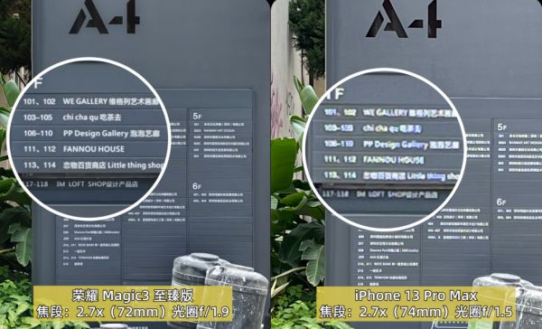 当用中长焦拍摄远处的文字时,荣耀会触发多摄融合,中心画质经过长焦画面的融合,文字非常清楚。iPhone 在 1x-3x 之间,依旧没有触发深度融合,可以代表数码变焦的普遍效果参考,差异还是很明显的,而且离得越远,焦段约接近 3x,差距就越明显。
