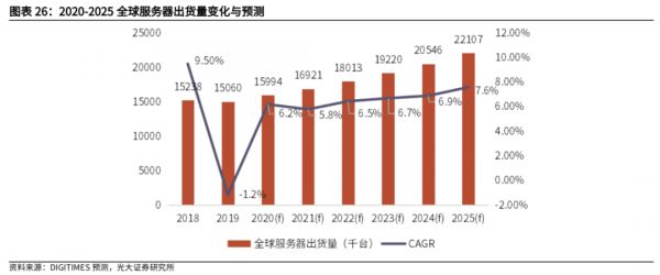 聚焦“量”能,受益于云计算、5G、AI等行业的发展,全球服务器行业有望迎来大发展。据DIGITIMES预计,2020年至2025年全球服务器出货量的年化复合增长率将达到6.7%。