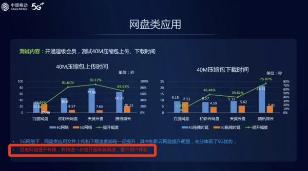 该评测是在开通超级会员的情况下,测试40M压缩包上传、下载时间。其中和彩云、天翼云盘、腾讯微云,在5G网络下所需的上传和下载时间相比4G均有大幅提升,而百度网盘在5G和4G网络下则基本持平。最终的结论是,5G网络下,大部分网盘类应用文件上传和下载速度均提升明显。但报告特别指出,百度网盘提升有限,有待进一步放开服务器限速,提升用户体验。