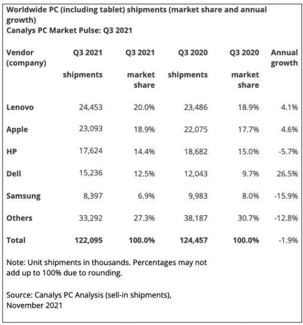 全球第三季度PC出货量增4.7%,苹果出货量增加市场份额缩水