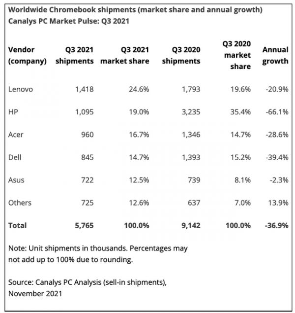由于整体市场大幅萎缩,Chromebook厂商在第三季度陷入了困境。联想以140万台的出货量稳居市场首位,同比下降了21% 。由于专注于放缓的美国教育市场,惠普失去了在Chromebook市场的领导地位,出货量同比下降了66% 。宏碁、戴尔和华硕占据了前五名的其余部分。