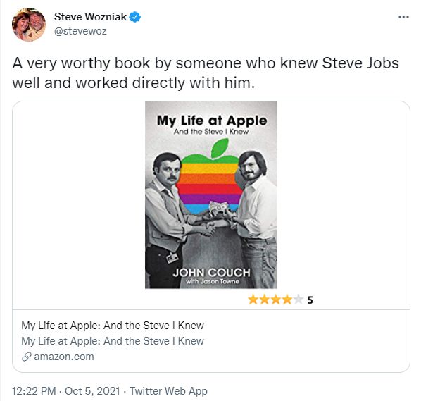 10月5日是乔布斯的忌日,沃兹发推文推荐一本关于乔布斯的新书《My Life at Apple》,介绍语是“非常了解史蒂夫·乔布斯并直接与他合作的人写的一本非常有价值的书。”