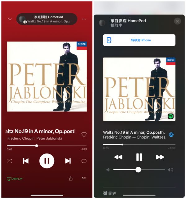 首先说说音频接力,由于我日常更多使用 Spotify,不方便直接通过 Siri 来播放音乐,更多还是通过将手机靠近 HomePod mini 快速地将音乐接力播放。不得不夸一夸整体的交互设计和 Taptic Engine 带来的细腻震动,反正我是特别喜欢来来回 回将手机和 HomePod mini 反复靠近把玩。