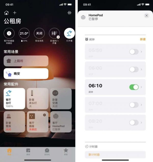不过随着我开始使用 HomePod mini,我发现对我来说,它最实用的功能竟然是定闹钟。是的,你没有看错,每天晚上准备睡觉前,我都会来一嗓子让 HomePod mini 打开我设置好的闹钟,由于我的 HomePod mini 位置处于客厅,每天早上当浑厚且并不悦耳的闹钟声响起时,要想关闭音箱的声音,我就必须深吸一口气,然后吼出「Hey, Siri」,一嗓子下来,基本人也清醒了大半,相比于触手可关的手机闹钟,位置遥远的 HomePod mini 反而更像是一个称职的闹钟。