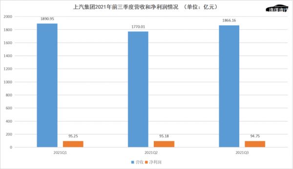 上汽集团2021年前三季度营收和净利润情况,数据来源于财报,连线出行制图