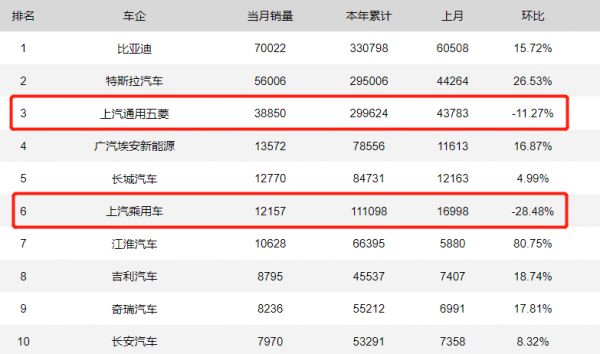 而在当月,这两个品牌的新能源汽车销量还同时陷入环比下滑之中,上汽通用五菱环比降幅为11.27%,上汽乘用车更为严重为28.48%。在其他车企环比增幅纷纷上涨的格局下,这样的下滑尤为明显。