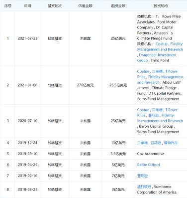 Rivian创立于2009年,原本是平价跑车生产商。但2018年的洛杉矶车展上,Rivian推出两款纯电产品——SUV R1S和皮卡R1T,瞬间走红市场。于是,自2018年至今,Rivian完成了总额超过105亿美元的天价融资,仅2021年内就超过50亿美元,亚马逊和福特都成为核心投资者,贝索斯还亲自为它宣传。这推动它的估值蹿升到外界流传的600亿美元。而由于与特斯拉产品的错位竞争,它也被认为有能力在特斯拉之外率先占据新市场主导权。
