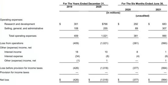 Rivian在2019年和2020年分别亏损 4.26 亿美元和10.18亿美元,今年上半年亏损9.94亿美元。同时,由于产品下线晚,公司只有9月实现了小部分营收。长期来看,为了维持产品的优势地位,Rivian还必须付出不小的研发成本,即使融资量惊人,这也将给其运营带来压力,2020年的研发投入约为7.66亿美元,今年上半年的研发投入已经达到6.83亿美元。