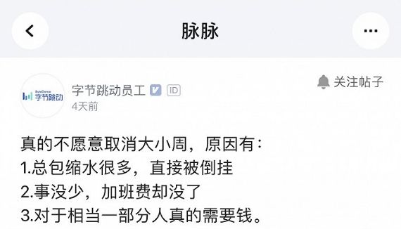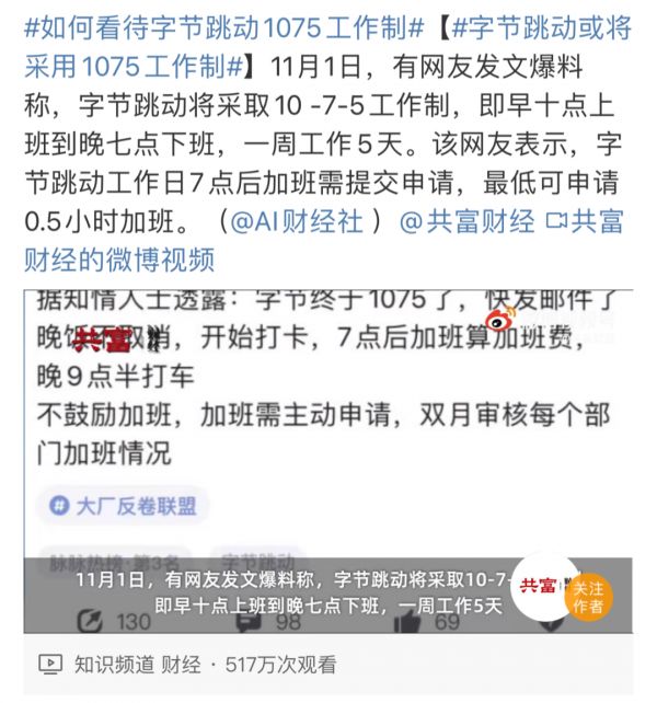 11月1日,有字节跳动员工在第三方社区脉脉透露,字节工作时间将要从996加班模式转变为“1075”,即“早10点晚7点,加班最小单位以0.5小时计算”,同时节假日加班,需要支付加班费用。
