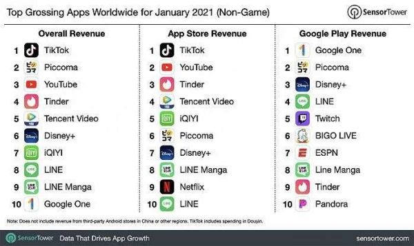 据Sensor Tower报告显示,2021年1月到9月,TikTok一直蝉联全球非游戏应用下载量冠军,每月为字节跳动贡献1.3亿美元收入。按此计算,全年突破10亿美元收入不成问题。今年6月字节公布的财报来看,字节2020年亏损147亿元。也就说,TikTok一年收入尚可弭平母公司亏损。